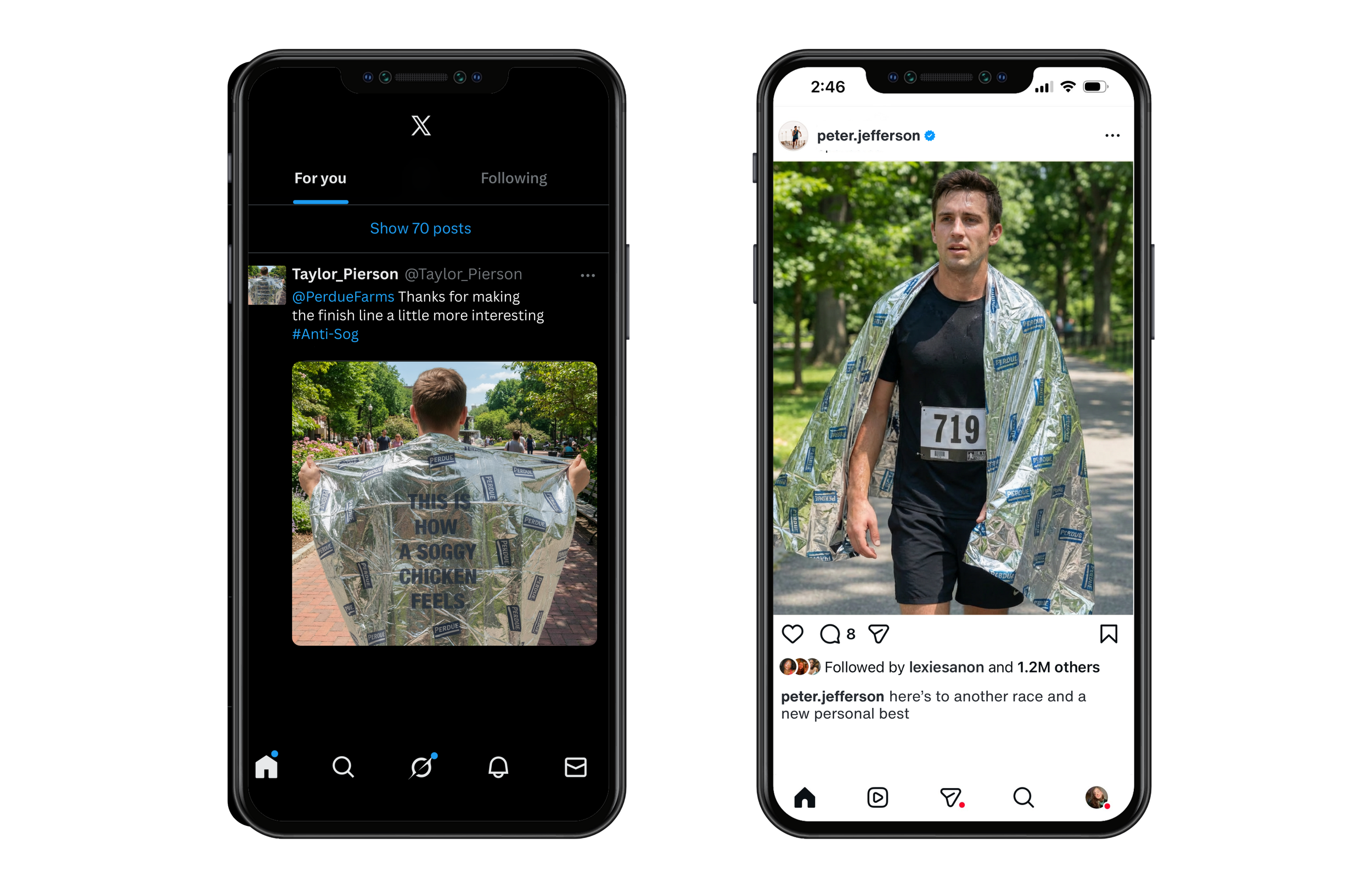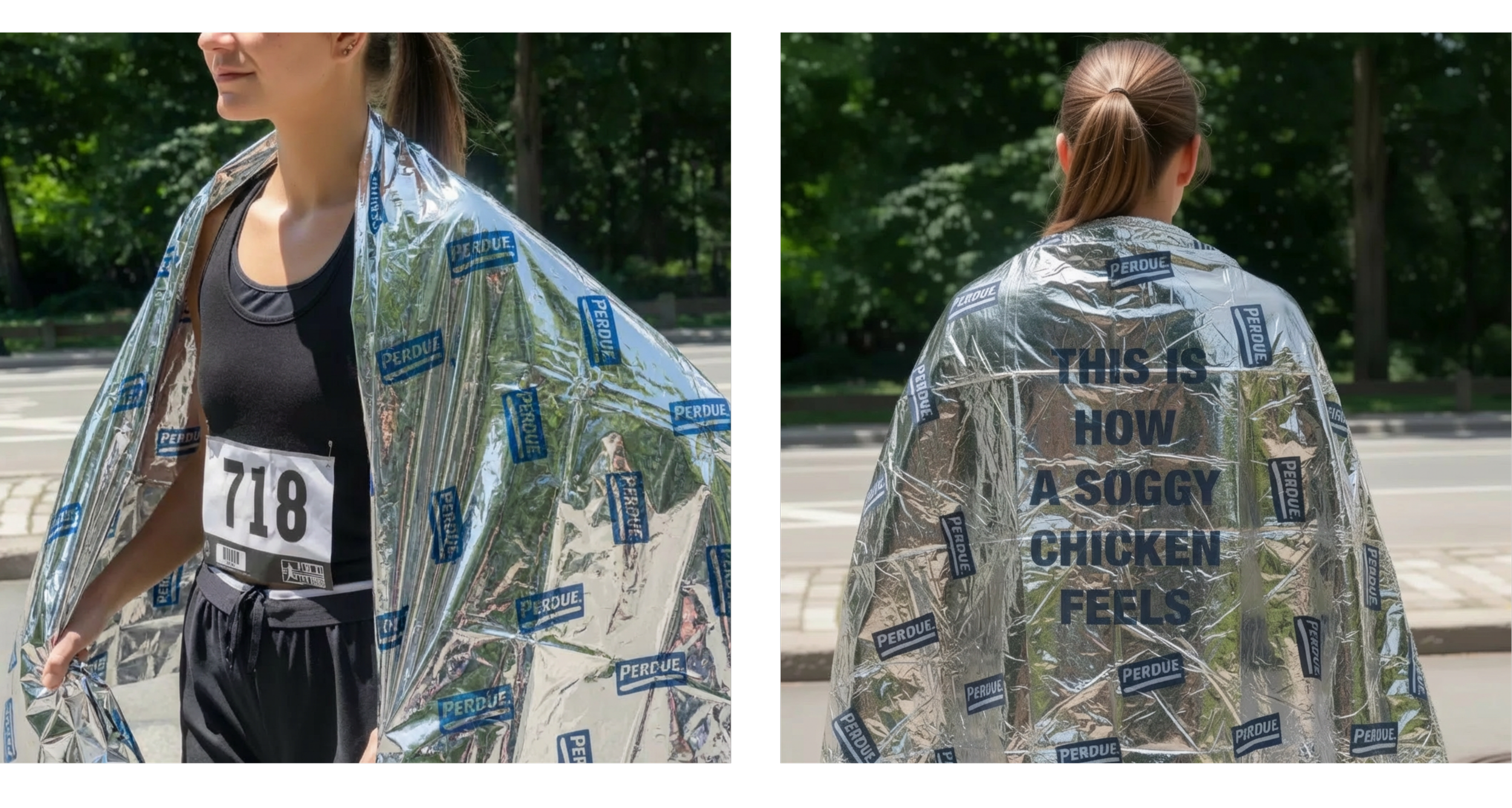 At various marathons across the country, runners will receive Perdue-branded foil blankets that use their post-race sweat to drive home the anti-soggy message.
