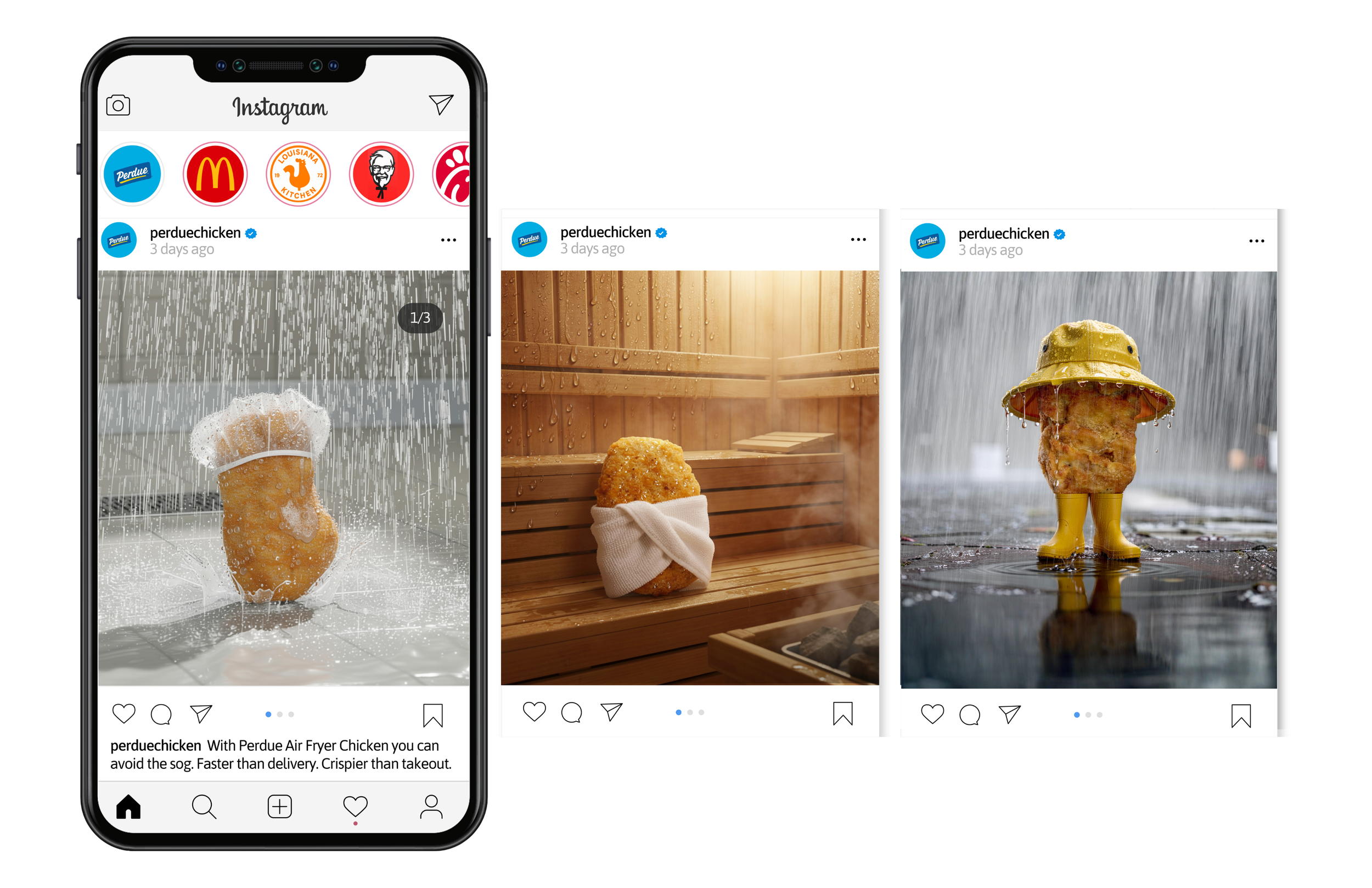 Perdue will post a content series showing an innocent chicken nugget in unfortunate soggy situations to warn against the fate of takeout and offer a crispy solutions.